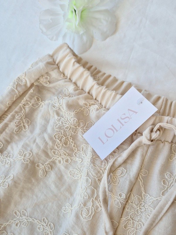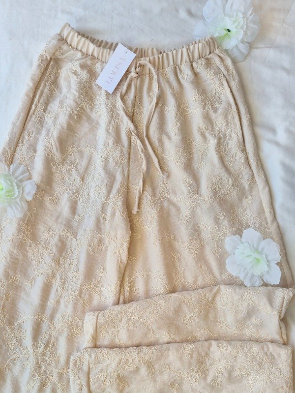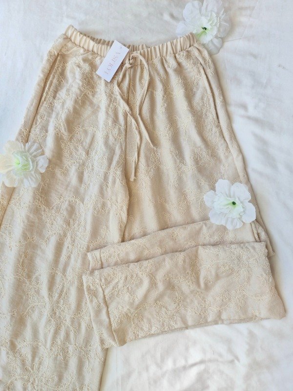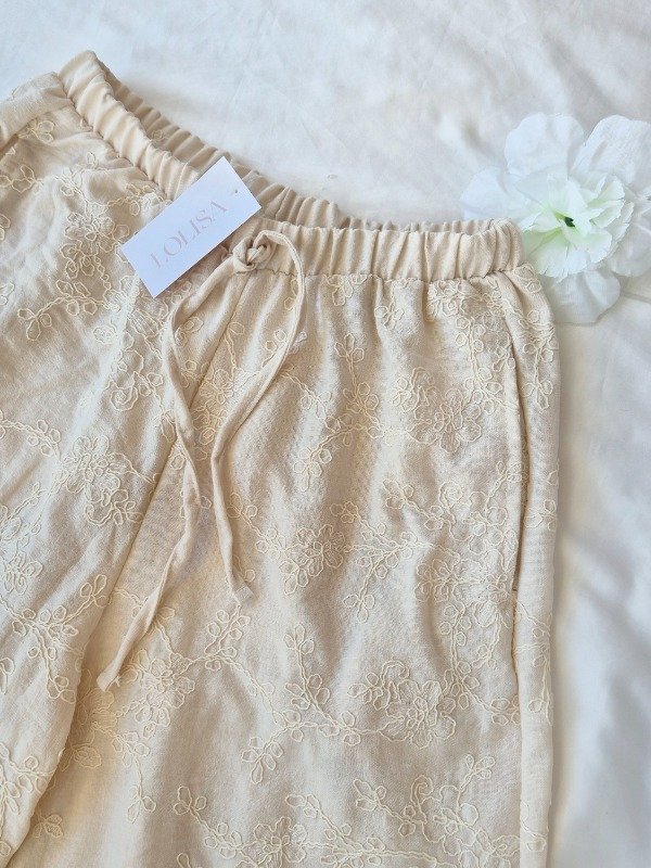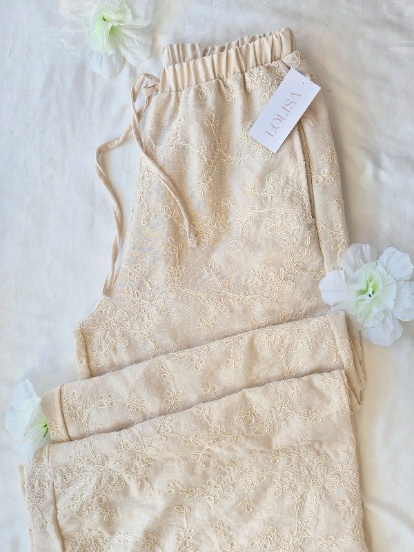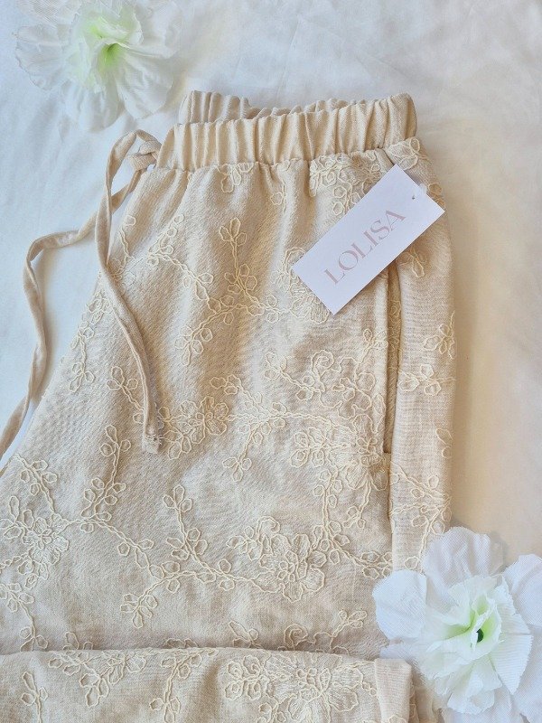 Confeccionado en lino bordado. Mide: 52 cm cadera - 53 cm cintura - 100 cm largo.