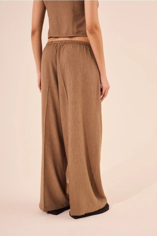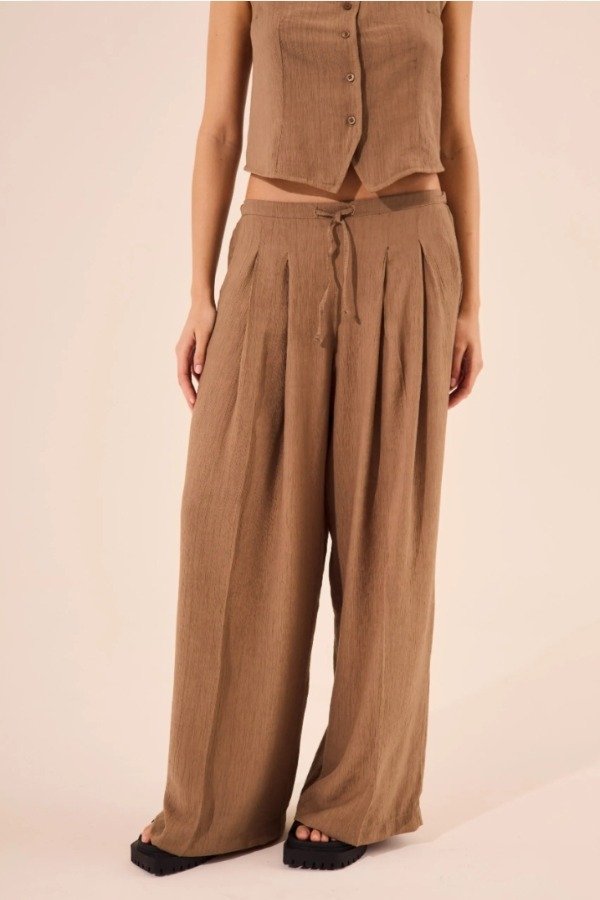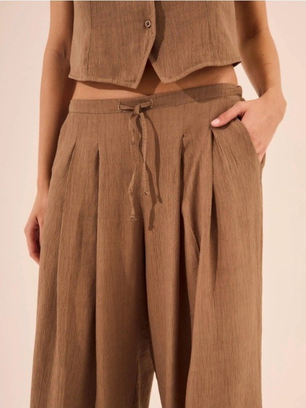 Pantalón wide leg de calce holgado, tiro medio con pinzas en delantero y tira de ajuste en cintura.
